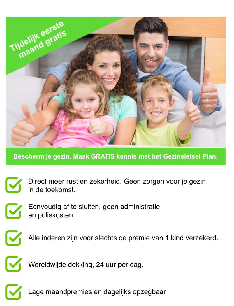 Het Gezinsletsel Plan kun je vol vertrouwen je leven blijven leiden zonder je constant zorgen te moeten maken over tegenslagen en ongelukken. Het Gezinsletsel Plan kent als aanvullende verzekering voor gezinnen meerdere dekkingen, waarmee je jezelf en je gezin tegen allerlei financiële tegenslagen beschermt.